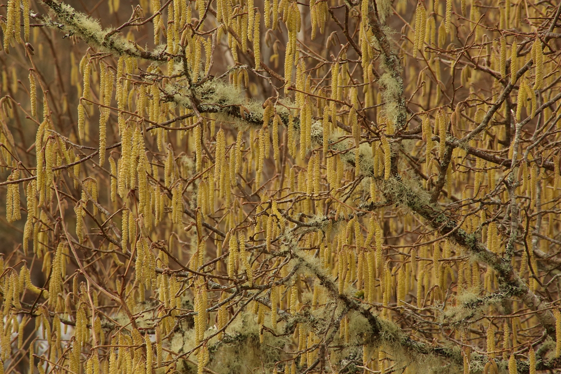 The huge number of catkins on the hazels this year will produce a bumper crop of hazelnuts in the autumn.