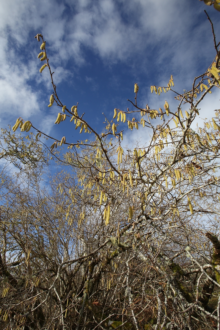 By the time of my visit there this day, at the beginning of March, the catkins were just about at their peak, with many of them fully extended and open, but others still to lengthen a bit more, as they stretch out from their buds. One hazel in particular, which had a lot of lichens growing on its branches, was festooned with masses of catkins, in a density and abundance that was almost overwhelming in its sheer profligacy.