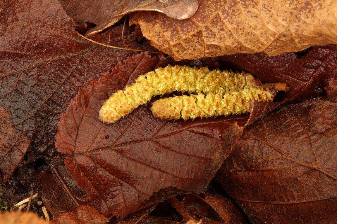 As I looked around, I saw quite a few catkins on the ground, scattered here and there. However, the total number that had been lost to the wind like this was a tiny proportion of the catkins still on the tree itself, so their loss would have had a negligible effect on the hazel’s reproductive prospects. One of the fallen catkins looked for all the world like a motionless green caterpillar, resting on a fallen hazel leaf.
