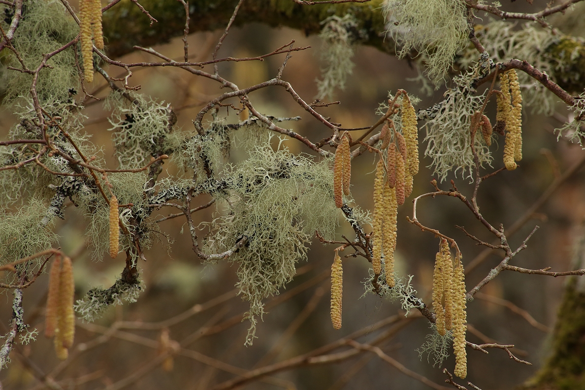 By this time, I’d moved about 20 metres from the hazel I originally stopped to photograph, and had turned my attention and camera to another tree nearby. It had a more sprawling branch structure, and was even more heavily-laden with lichens than the first one. While it still had large numbers of catkins on it, they didn’t seem quite as prolific as on the other tree. It looked like it was an older hazel, particularly given its growth form, so it may be that it was past its reproductive prime and therefore less profligate with its flowering.
