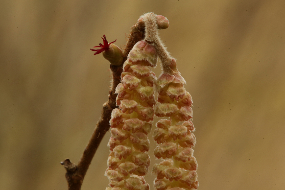 Hazel catkins are the tree’s male flowers. In contrast to their abundance and showiness, the female flowers are few in number, small in size and almost inconspicuous. They are tiny red tufts that emerge from the tip of some leaf buds, and one can be seen in the photo here on the right. They rely on the wind to blow pollen on to them when it is released by the male catkins.