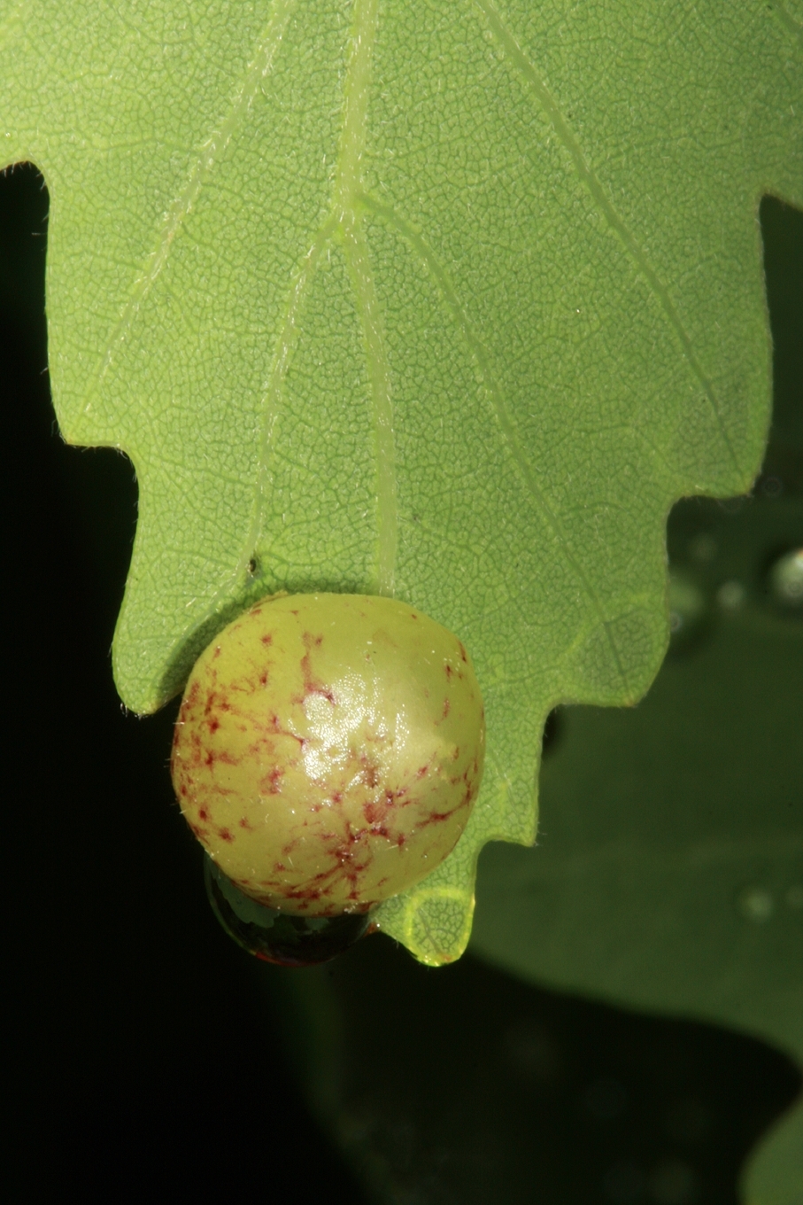 When the adult wasps emerge from the currant galls, the males and females mate, and the females lay eggs on the leaves of the oak, which then induce the tree to produce the disc-shaped spangle galls that sometimes occur in their dozens on each individual leaf. When the leaves fall to the forest floor in the autumn, the wasp larvae live on within them, overwintering there, and then a new agamic generation of females emerges in the spring, to begin the whole cycle again .