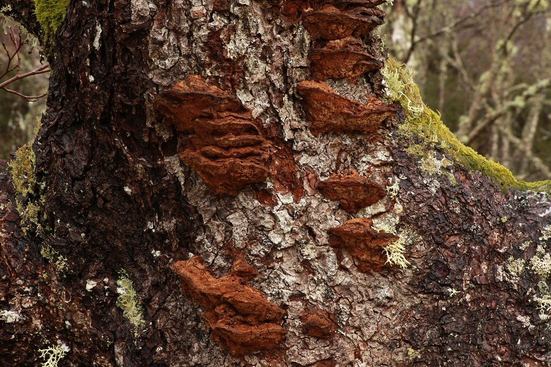 Leaving the frozen pools behind, I walked towards the cascades on the Allt a Choire Bhuidhe burn, thinking there might be some ice left there still, as the falls are quite shaded by the surrounding trees and juniper bushes. On my way I passed a dead alder tree (Alnus glutinosa) that had a couple of different species of fungi fruiting on its trunk. One of these consisted of a group of bracket fungi which were past their best condition, so I wasn’t able to identify them myself. However, I collected a sample to send off to an expert, and I hope she subsequently confirmed they are the alder bracket fungus (Inonotus radiatus).