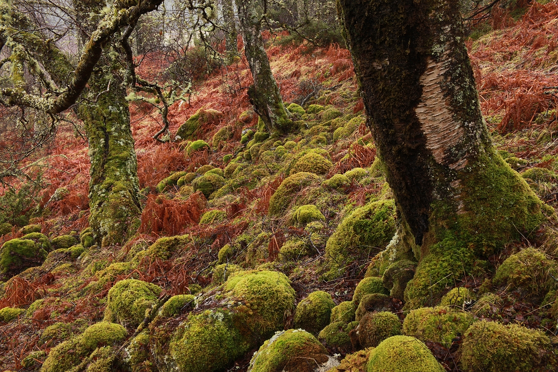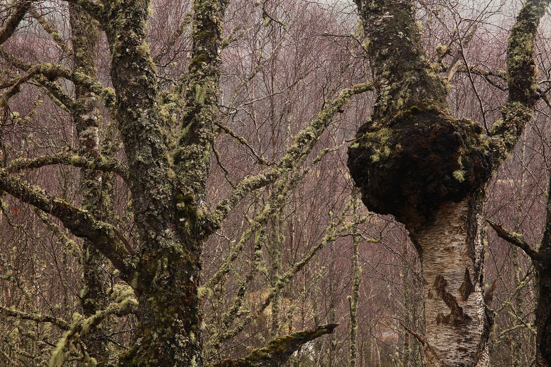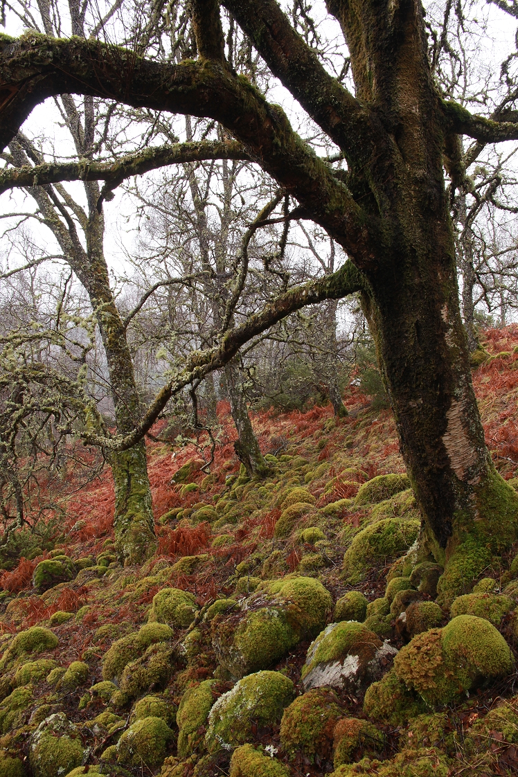 Moving away from the burn, I wandered through the birchwood, as the rain began to fall more steadily and heavily. I was drawn to a group of character-filled old birches growing in a small hollow, that were surrounded by numerous small boulders, all covered in moss. The moisture from the rain made the green colour of the moss particularly rich and vibrant, and it really stood out on what was otherwise quite a dull and almost monochrome landscape.