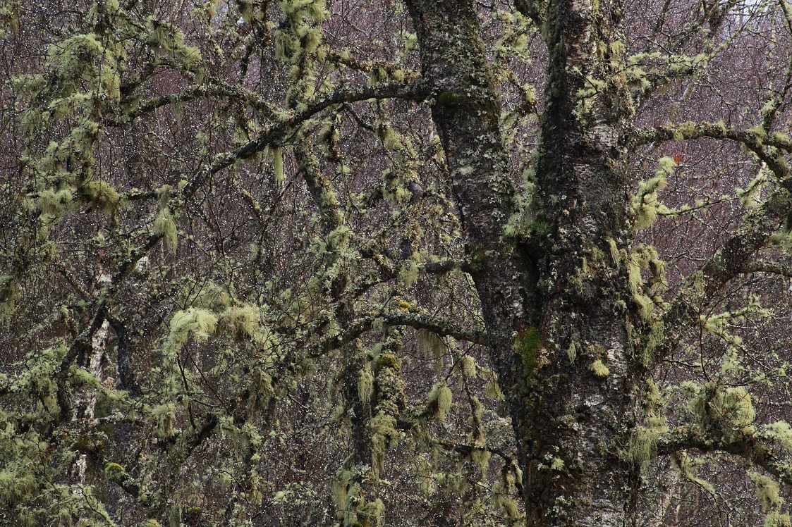 By this time it was quite wet, with constant rain, and I was struggling to keep my camera equipment dry. Despite having an umbrella over the camera and tripod, raindrops still managed to get on to the lens, so I was continuously having to dry it off and delete the images which had raindrops visible in them. By contrast, the abundant lichens on the branches of the trees were relishing the rain – they look at their best when it is wet like this.