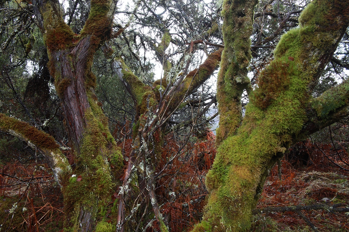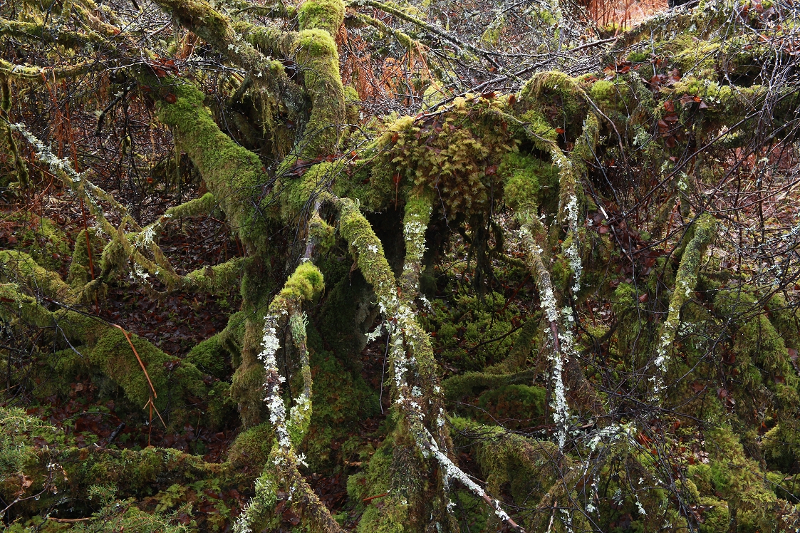 It was almost time to finish up for the day and head for home, but as I began to walk back to the car park, my attention was drawn by some mature junipers (Juniperus communis) that were festooned with moss. The dense growth of needles on junipers provides a sheltered and shady area underneath the foliage, and in the case of the large junipers at Dundreggan, this often forms a miniature temperate rainforest micro-habitat, which is permanently damp, and where the trunks are heavily-laden with mosses.