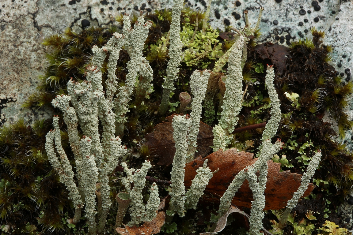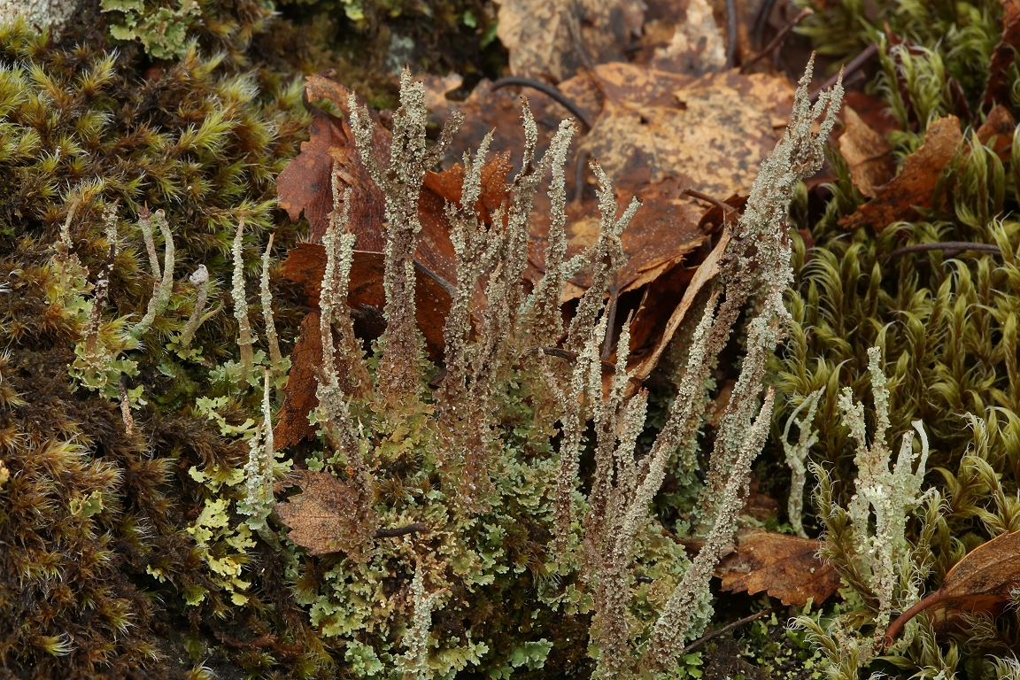 Close to the patch of acute-leaved bog-moss (Sphagnum capillifolium), there was a rock with some interesting lichens growing on it, so I spent some time photographing them too. There were patches of two different species of Cladonia lichen near each other on the same rock, but again I’ll have to get an expert opinion to confirm which species they are. We’ve had a couple of lichen surveys done at Dundreggan as well, and as a result we have records of 30 different species of Cladonia on the estate – it is one of the largest genera of lichens. For these lichens I took a number of photographs, varying the plane of focus slightly, and then ‘stacked’ them together, using the Helicon Focus software that I’ve written about in a previous blog, to get the resulting images here.