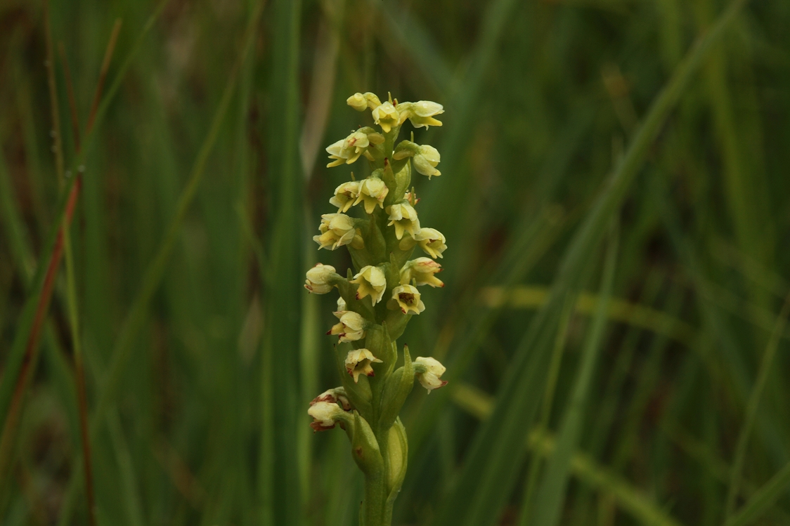 Continuing downhill for another 200 metres or so, I stopped to photograph another easily distinguished orchid that we’d seen earlier, on our way up hill. This was the small-white orchid (Pseudorchis albida), and it is less conspicuous, with its smaller size and pale colouration, than the marsh-orchids.