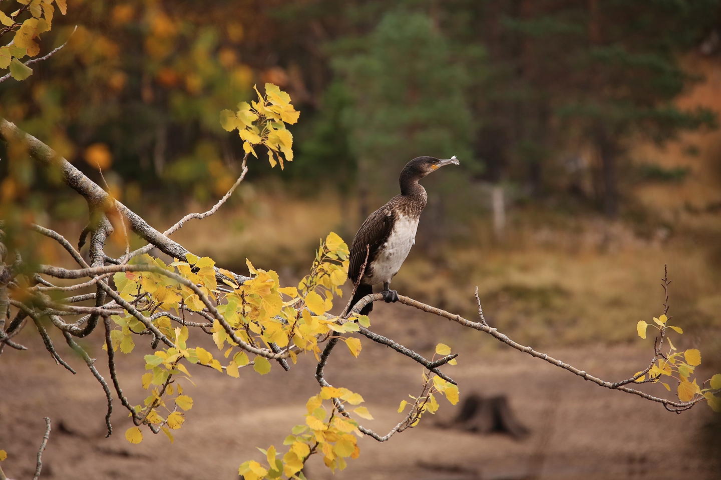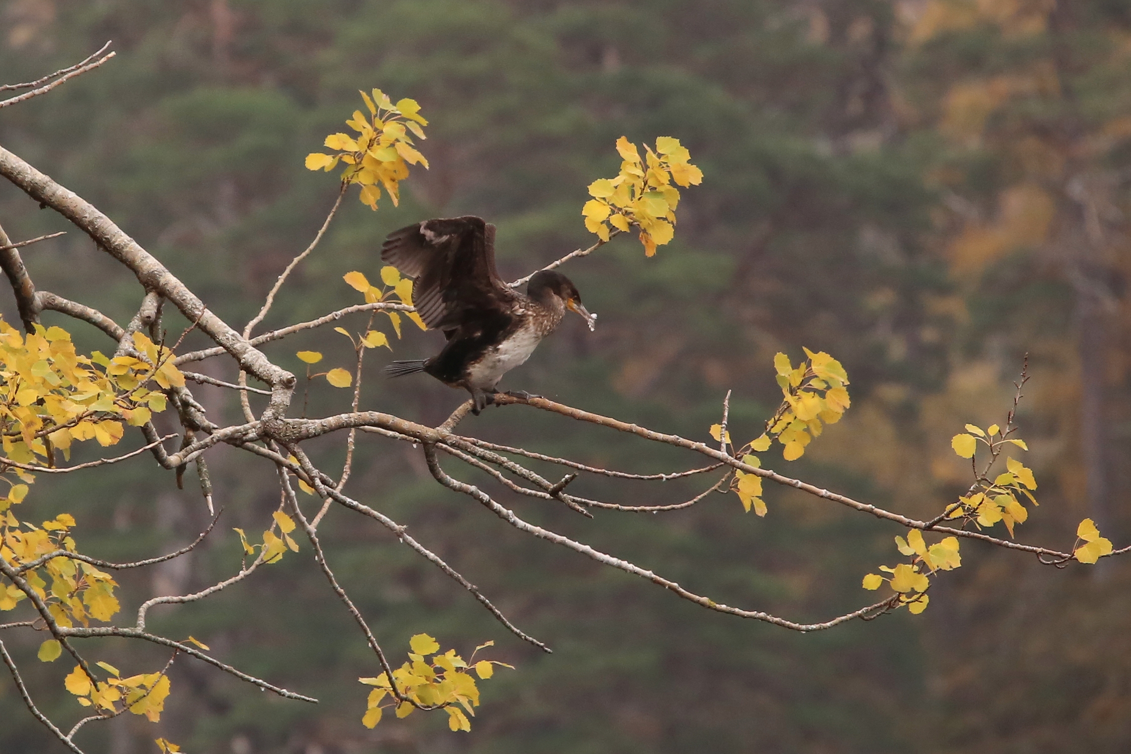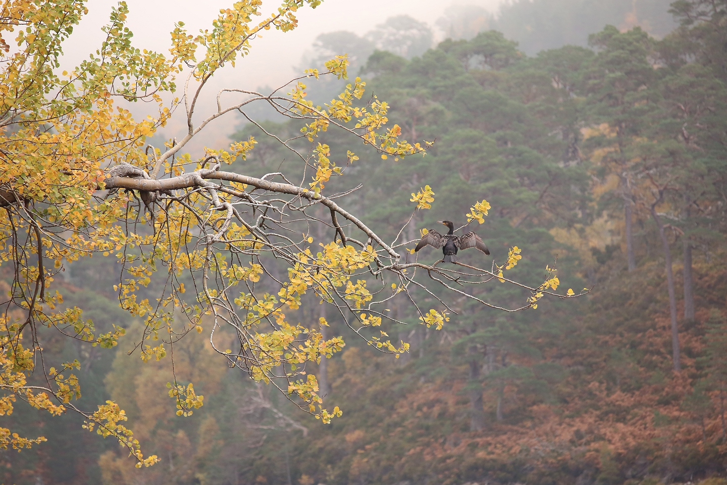 What was even more remarkable though was that the cormorant had picked an ideal spot to perch on the tree, in amongst the brilliant yellow-gold leaves of the aspen and with a superb backdrop of the ancient Scots pines of the Caledonian Forest on the other shore of the loch. As a photographer I couldn’t have asked for a more photogenic combination, and it felt like a very special privilege indeed to have this experience – a real gift of nature. The cormorant seemed completely unfazed by my presence, moving around on the branch and occasionally spreading its wings to let them dry, in what is very typical behaviour for this species.
