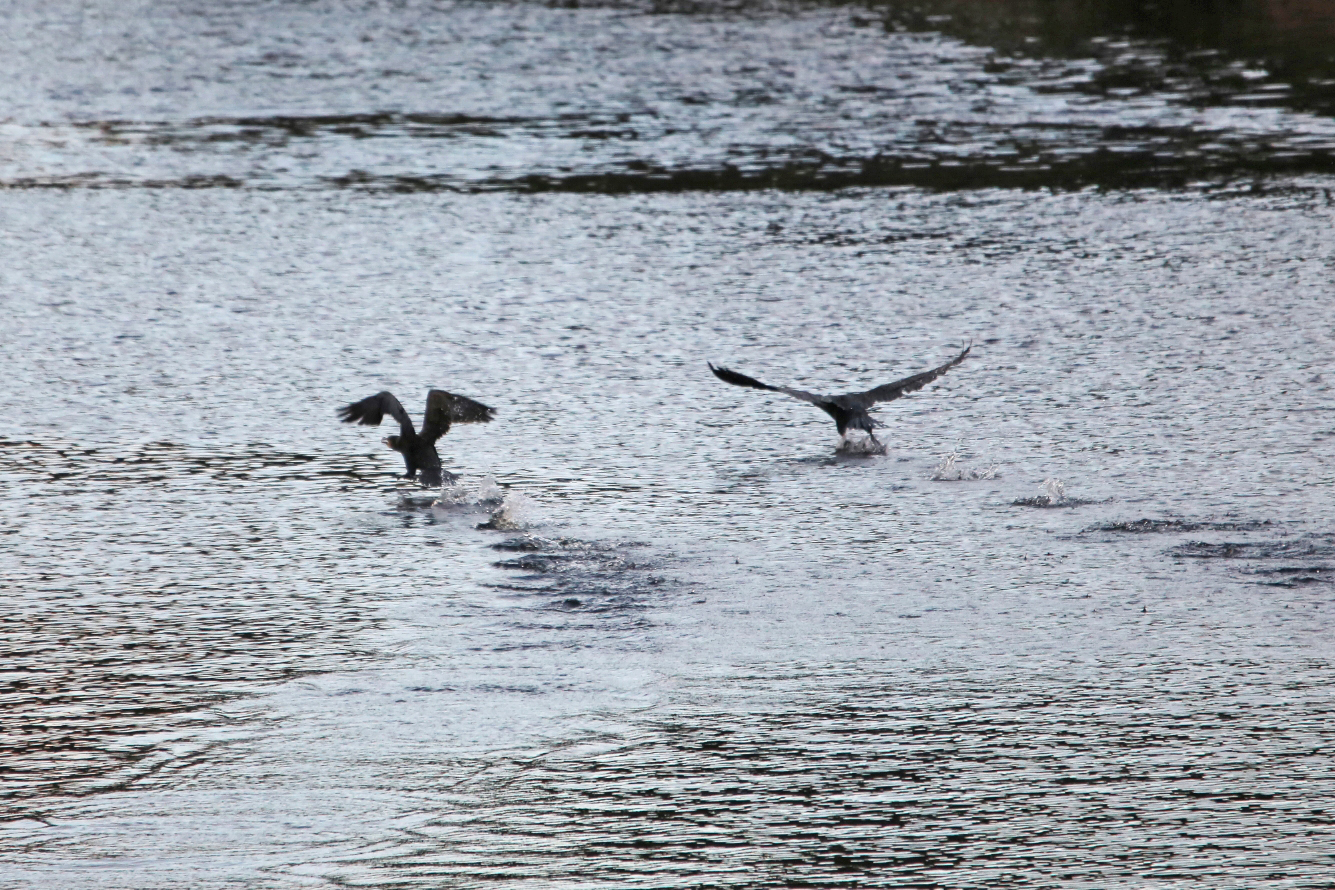 This was obviously a favoured location for the bird, and while I observed it, it was joined there by another cormorant. Excited at seeing a pair together I began to approach them again, in a similar fashion to earlier in the day. However, this time the birds were much more skittish and wouldn’t let me get very close at all. While I was still quite a distance from them, they took off from the aspen branch and landed in the water nearby. They were only there for a couple of minutes though, because as soon as I attempted to get close to them, they lifted off from the water and flew away.