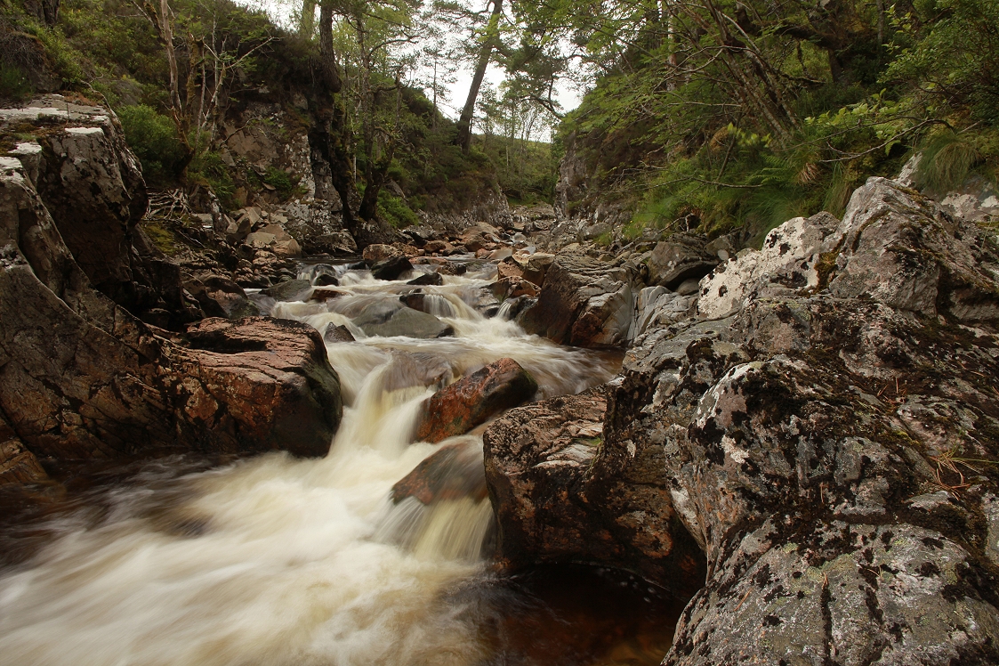 There are some mature Scots pines and other trees beside this section of the burn, and the tumbling cascades amongst rugged rock formations provides a powerful feeling of wilderness. Unfortunately, this too is likely to be degraded by a reduced water flow in the burn if the hydro scheme goes ahead.