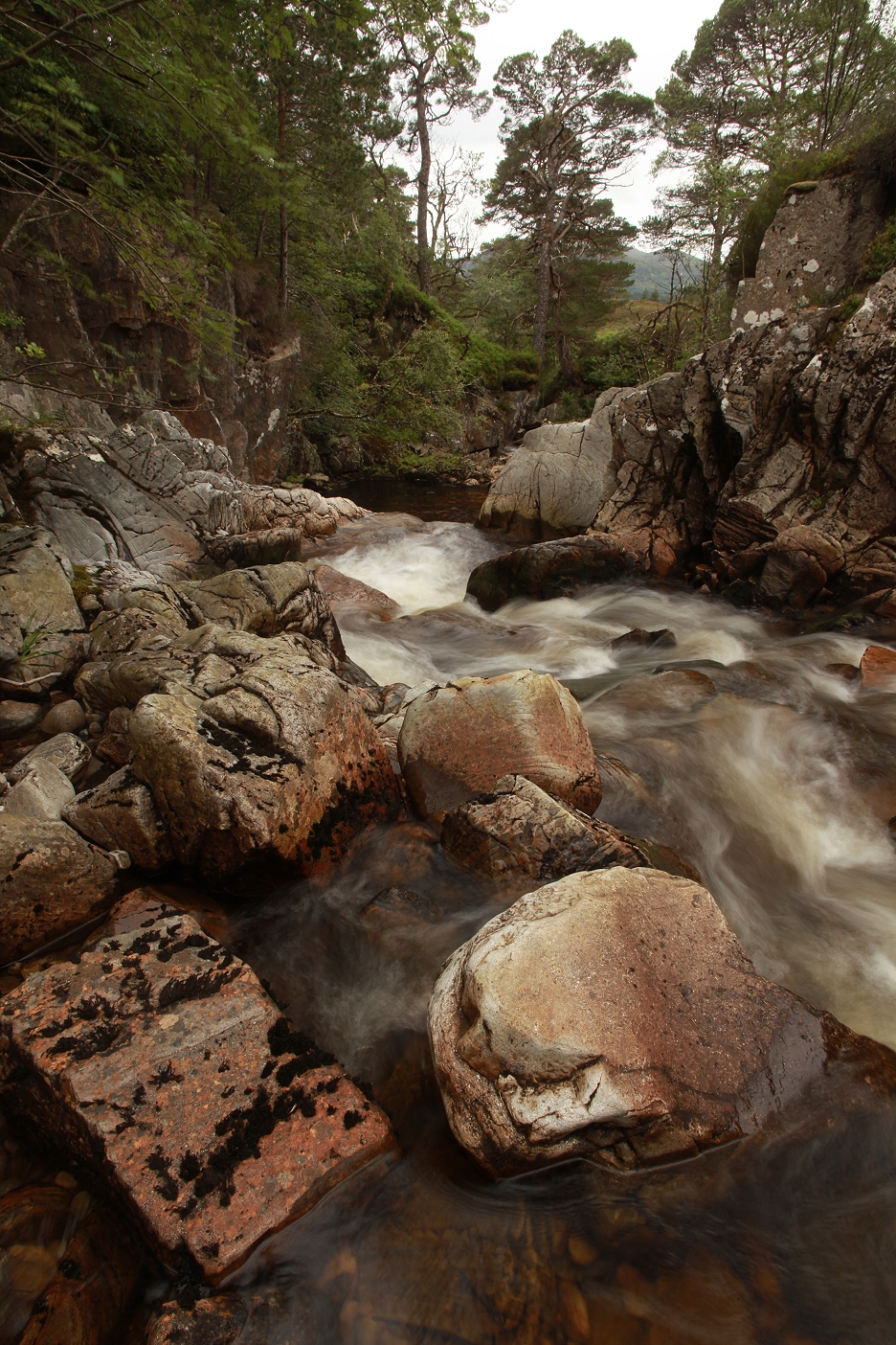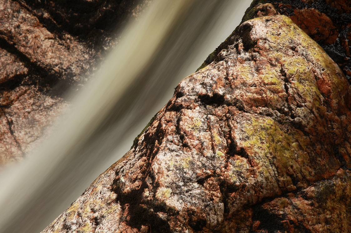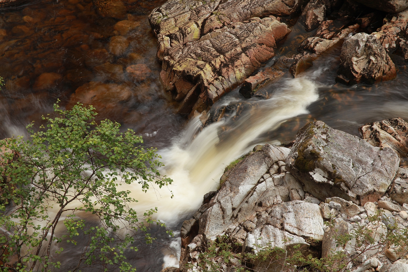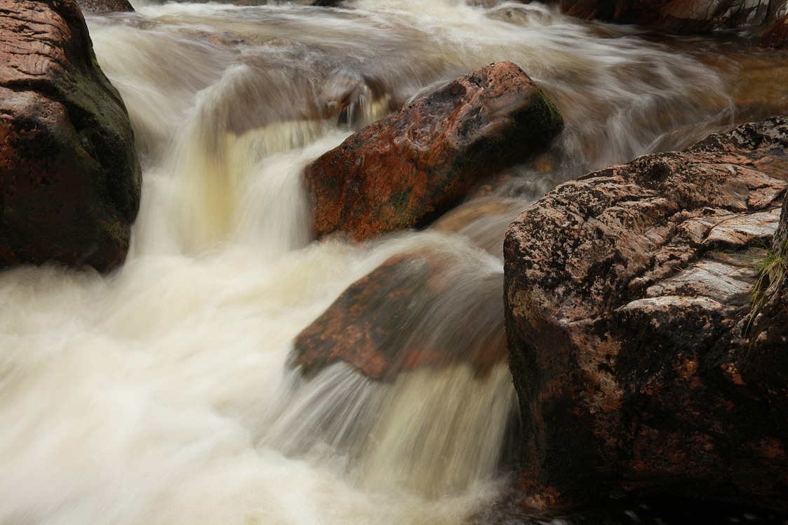 Descending into the gorge itself above the waterfalls, there were some beautiful rock formations, where the burn flowed in cascades over the sculpted bedrock. This was what I’d come to explore and I spent a while appreciating the beauty of the flowing water, taking plenty of photographs as I did so.