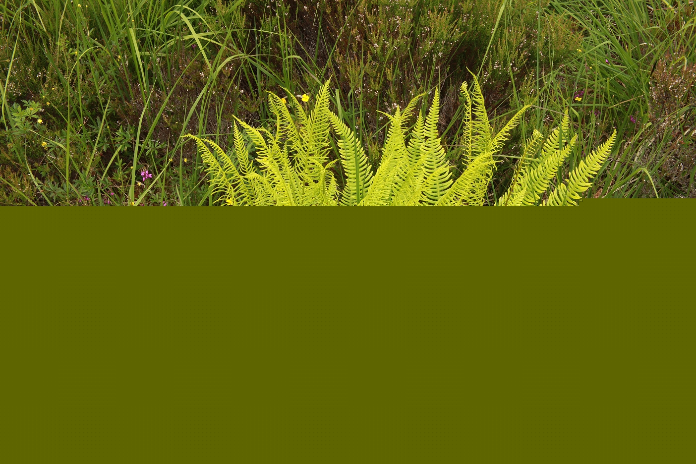 Continuing upstream, I was attracted to a heath-spotted orchid (Dactylorhiza maculata) that was flowering amongst some bell heather (Erica cinerea). The contrast between the differently-coloured blossoms was very pleasing to my eye … A few metres away, some more bell heather was flowering in amongst some hard ferns (Blechnum spicant), and the combination of fern frond and purple blossoms made for another interesting photographic composition.