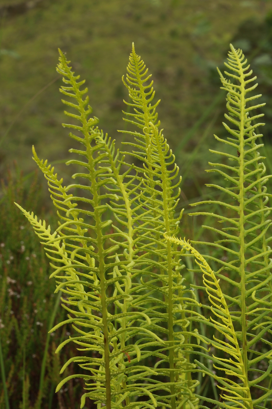 Hard fern has two different frond types on it. The low-growing sterile fronds are evergreen, while the upright fertile fronds, which release the fern’s spores, are more ephemeral, dying back each year. By being raised up by about a foot (30 cm.) or so, they provide a better opportunity for the spores to be dispersed by the wind, so that the fern can reproduce and grow in a new site, at some distance from its parent.