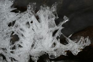 As I marvelled at the complex shapes of the ice, I realised that all of these patches had been created from spray coming off the burn itself. There had been no snow at all, and there wasn’t any ice on the surrounding land, so it was obvious that these patches must have accumulated gradually over a period of several nights of sub-zero temperatures. The spray must have frozen in place where it landed, and I could imagine how the ice formations had slowly increased, giving rise to the geometric shapes that I saw.