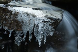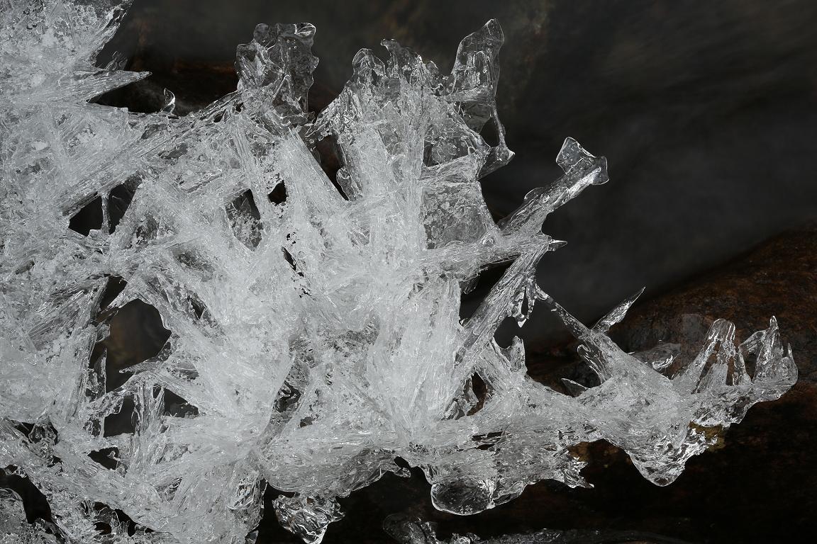 I really like the way that light is reflected off of natural ice formations, and the complex shapes of these icicles seemed to accentuate and amplify this effect. The water behind the icicles was very dark, being in the shade under the rock, and the contrast this made with the icicles also helped to emphasise the play of light on the different surfaces of the ice. This too was a transient beauty though, and I suspect that the ice would have melted completely in the next day or so …
