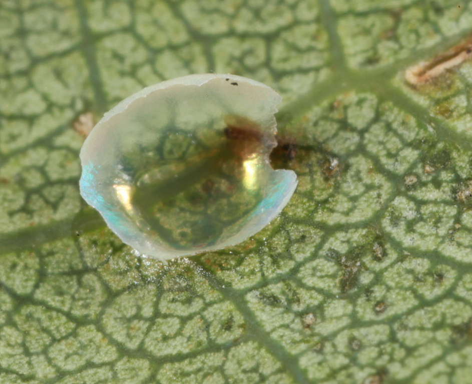 On a nearby leaf I found the remains of an egg which I suspect is the one that the caterpillar hatched out of – it looked like the right size, and was also similar to one of the poplar hawk moth that’s on the UK Leps website. However, the only way to be absolutely certain of this identification would be to be there when the caterpillar emerged – a rather unlikely occurrence!
