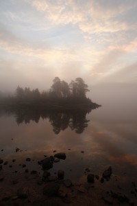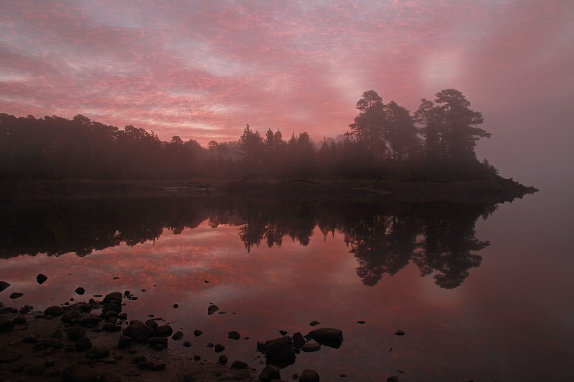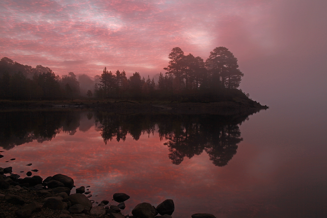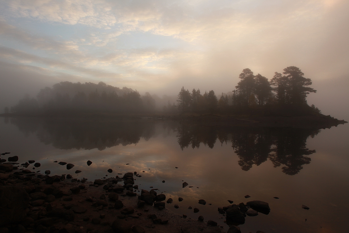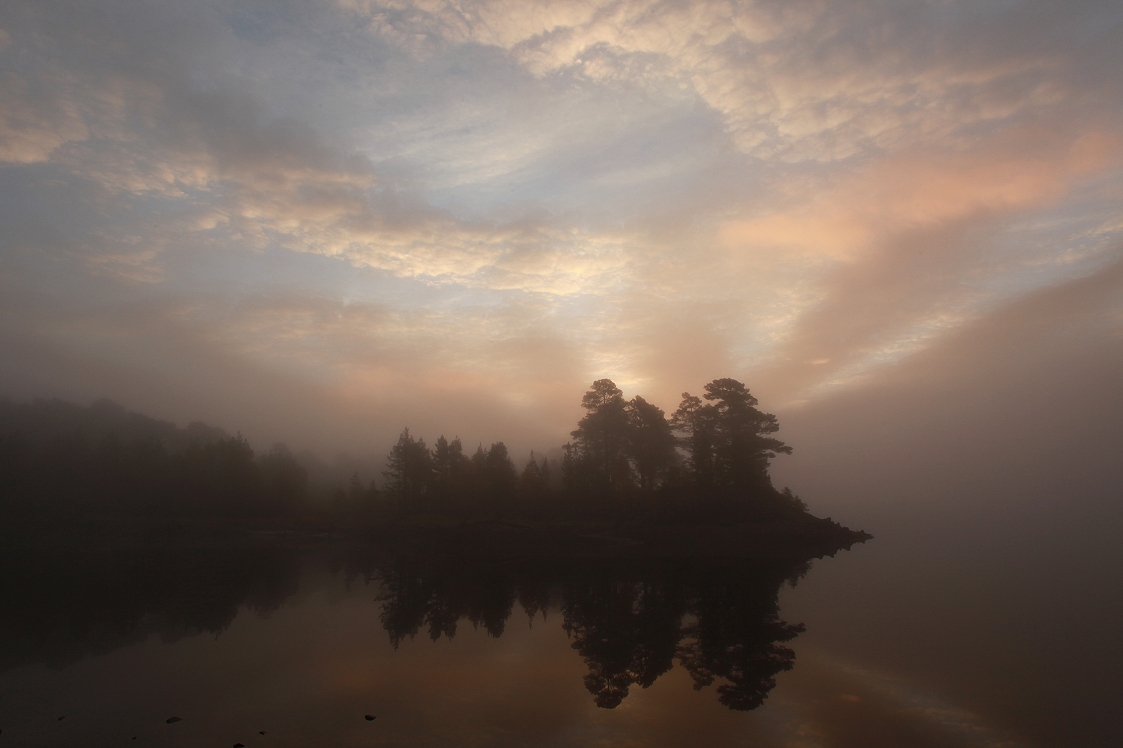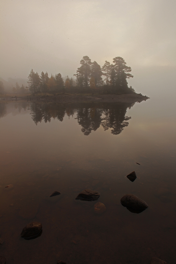 Here, the last of the fog was lingering over the old pines on the promontory on the other side of the loch, in a last memory of the conditions at sunrise.