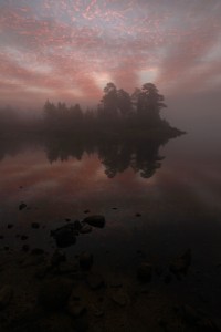 The combination of wind-still loch, shifting fog, silhouetted trees and sunrise colours made for some evocative photographs, and after half an hour or so, three other photographers arrived on the scene, but by then the dawn colours had already been and gone.