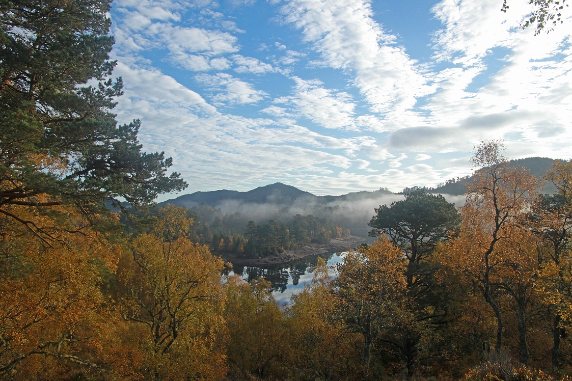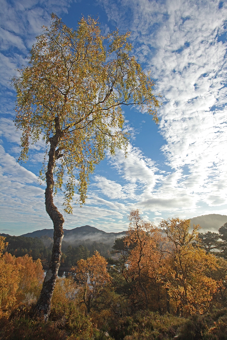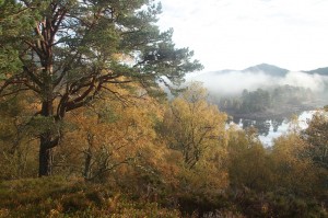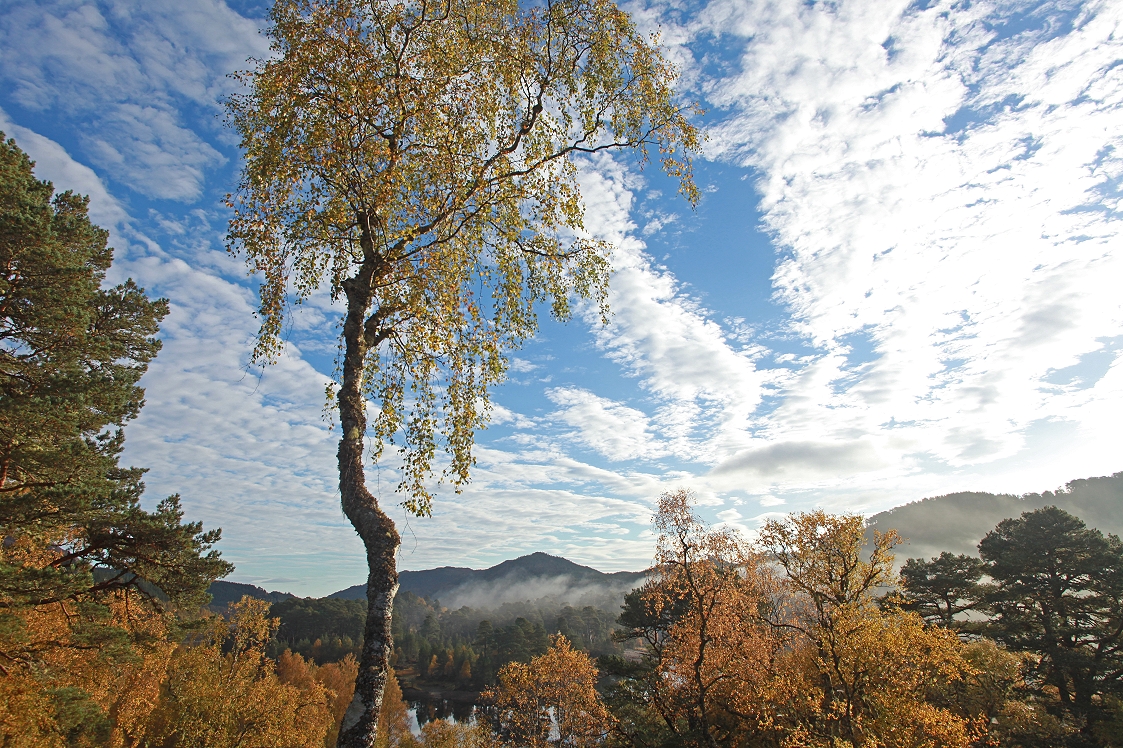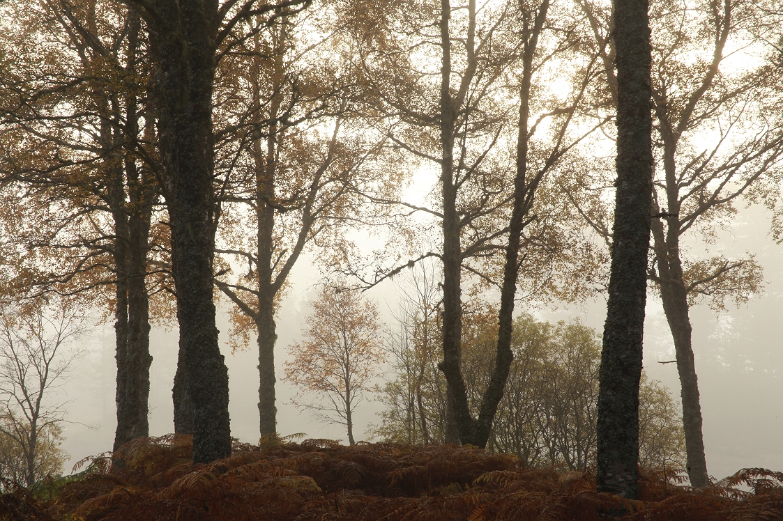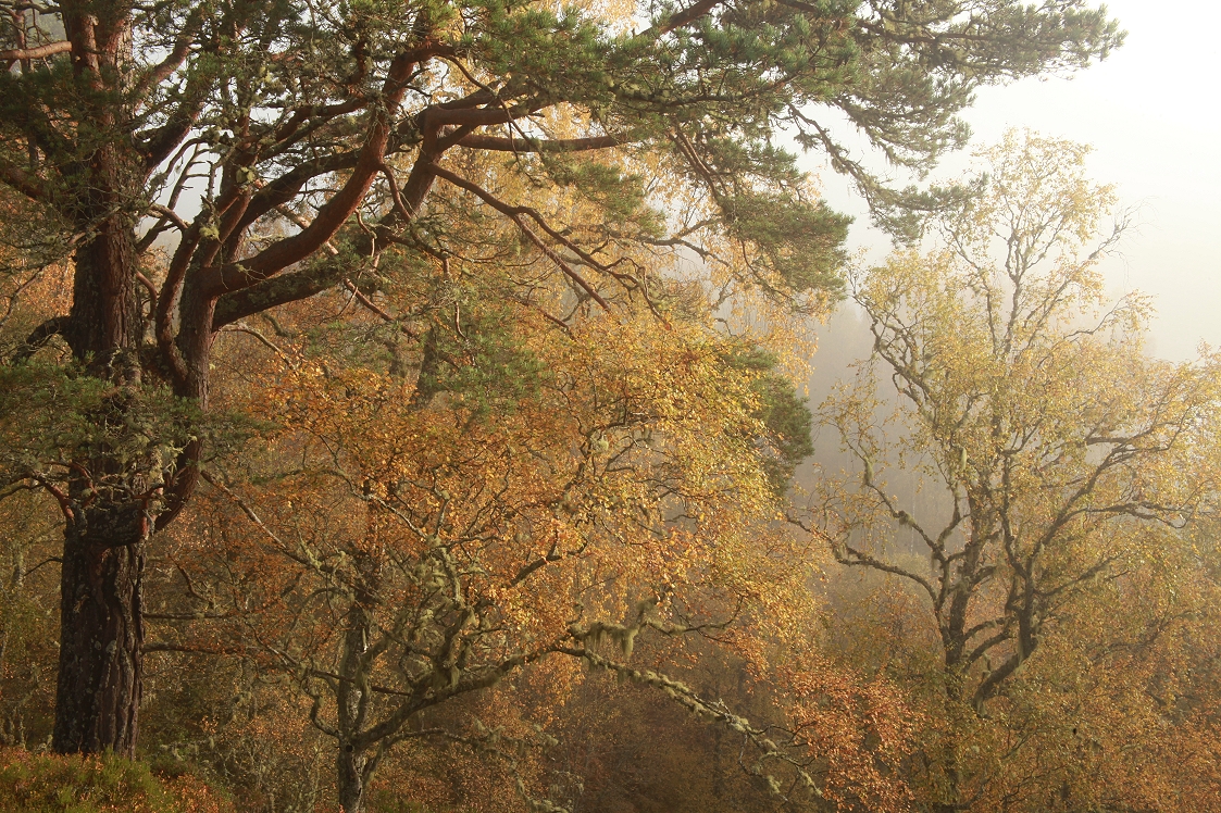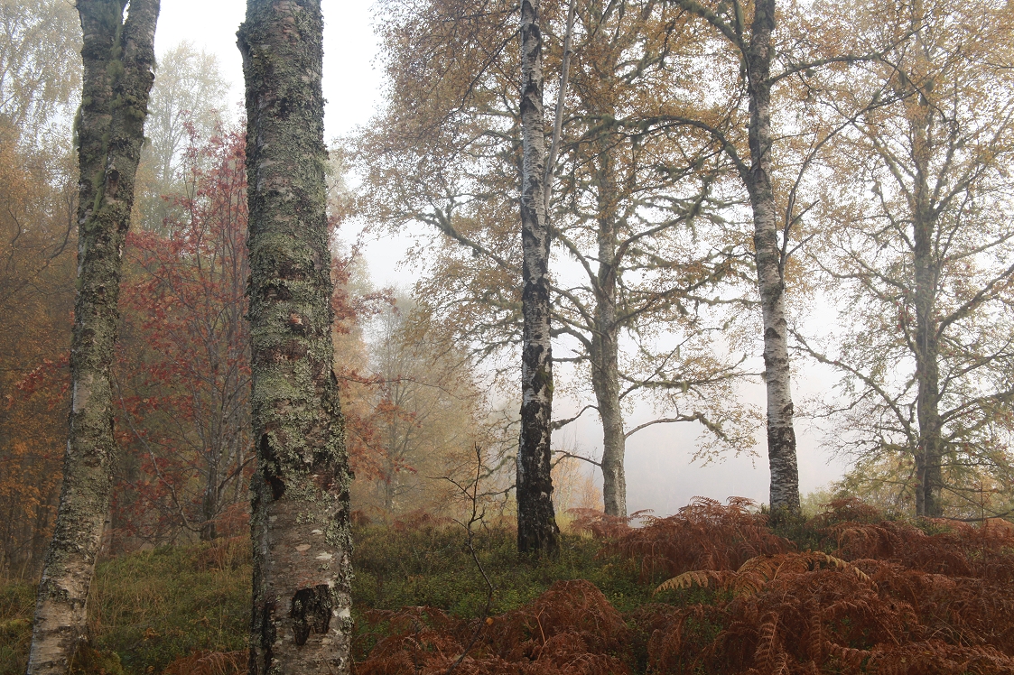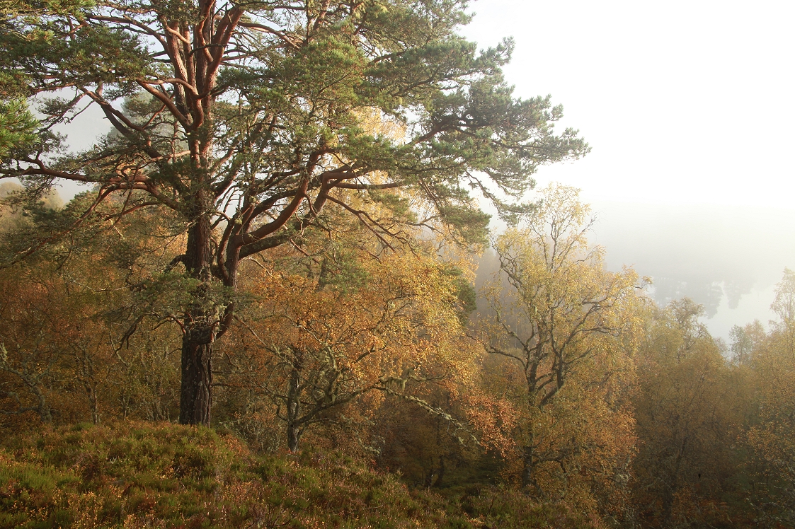 In the other direction, the ground fell away from the top of the knoll down towards the loch. There, a number of birches at the peak of their autumn colours, their branches covered with epiphytic lichens, contrasted with a solitary Scots pine that seemed to tower over them, because of the higher ground it was growing on. Looking closely, it was just about possible to see the water, through gaps in the branches, and where the fog was thinning out.