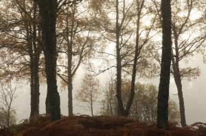 Birches and a rowan tree in the fog, near the shore of Loch Beinn a’Mheadhoin.
