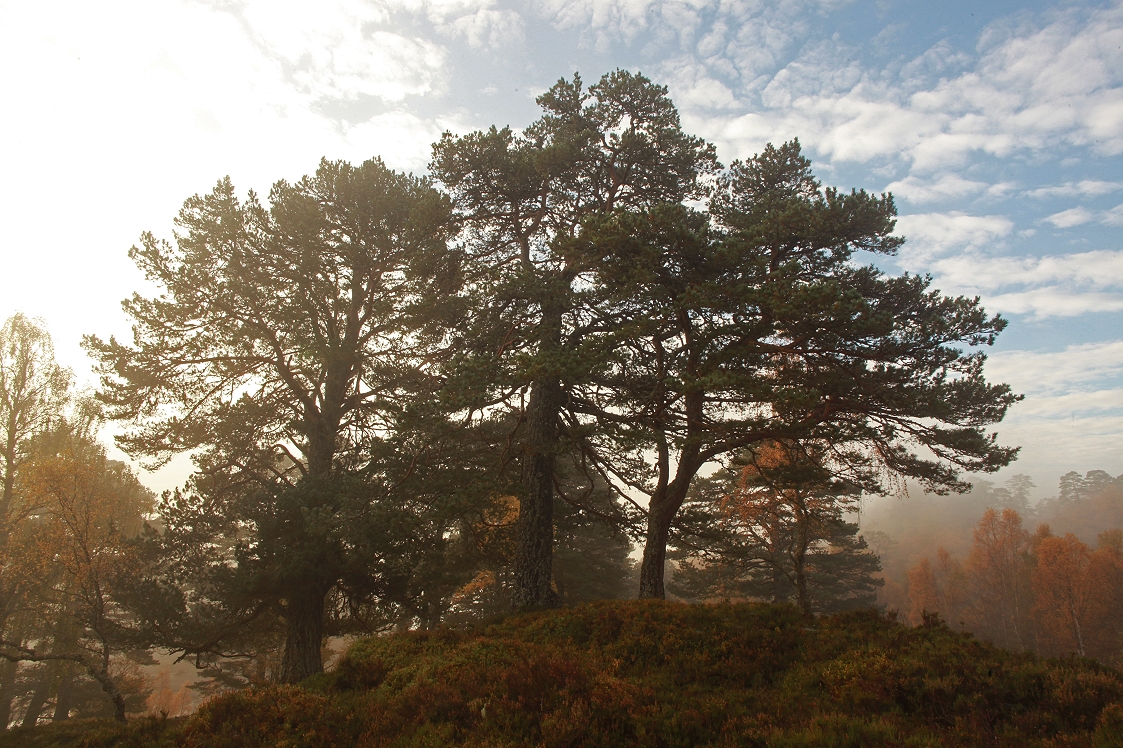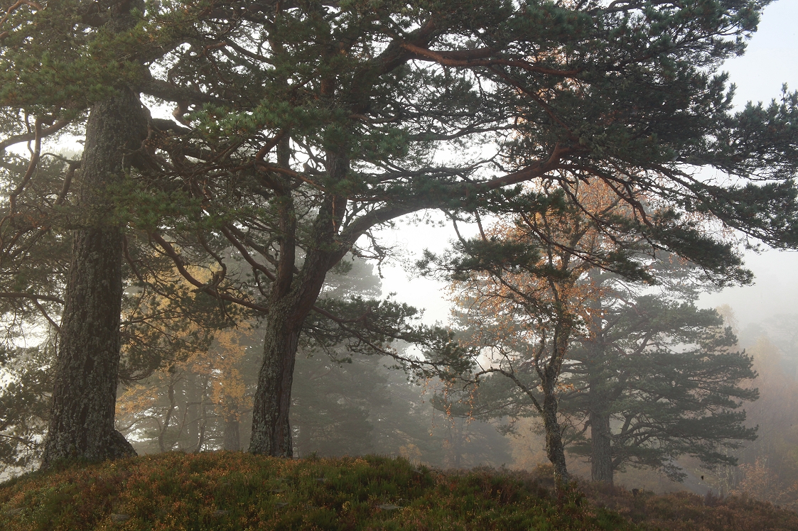 There’s a group of mature Scots pines (Pinus sylvestris) on top of a knoll near there, and I often go to it to get some good views out over the loch. As the fog was beginning to lift a bit I headed up there, hoping to catch some glimpses of the water as the air cleared. However, the fog was denser on top of the knoll, and the old pines seemed to loom out of the mist, almost like the Ents of Fangorn Forest in Tolkien’s ‘Lord of the Rings’.