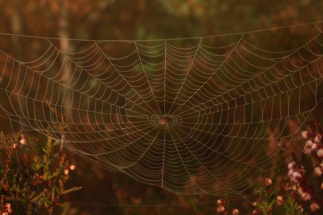 Web made by an orb web spider, in amongst heather plants on the knoll.