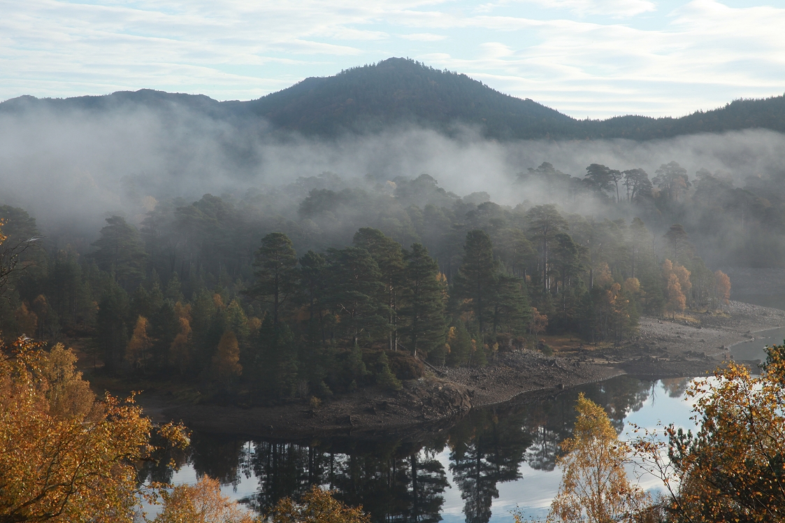 As I watched, the fog gradually lifted, slowly revealing more and more of the view from this beautiful spot. When it was clear enough to catch a glimpse of the loch, the promontory which I had photographed from the loch-side earlier emerged from the mist, still with a perfect reflection in the water. It was a breathtaking moment, on a breathtaking morning, and I was touched deeply again by the magical beauty of Glen Affric …