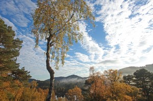 We have a saying for participants on our volunteer weeks at those times of year – ‘If you don’t like the weather, wait 5 minutes…’! – and that was exactly what happened on this day, because the shift from fog to sunshine was so rapid. After an hour or two of drifting fog and occasional glimpses of the loch, a complete transformation took place in a matter of minutes as the sun banished the last of the clouds, and the birch trees were illuminated in their full golden colour by the bright sunshine.