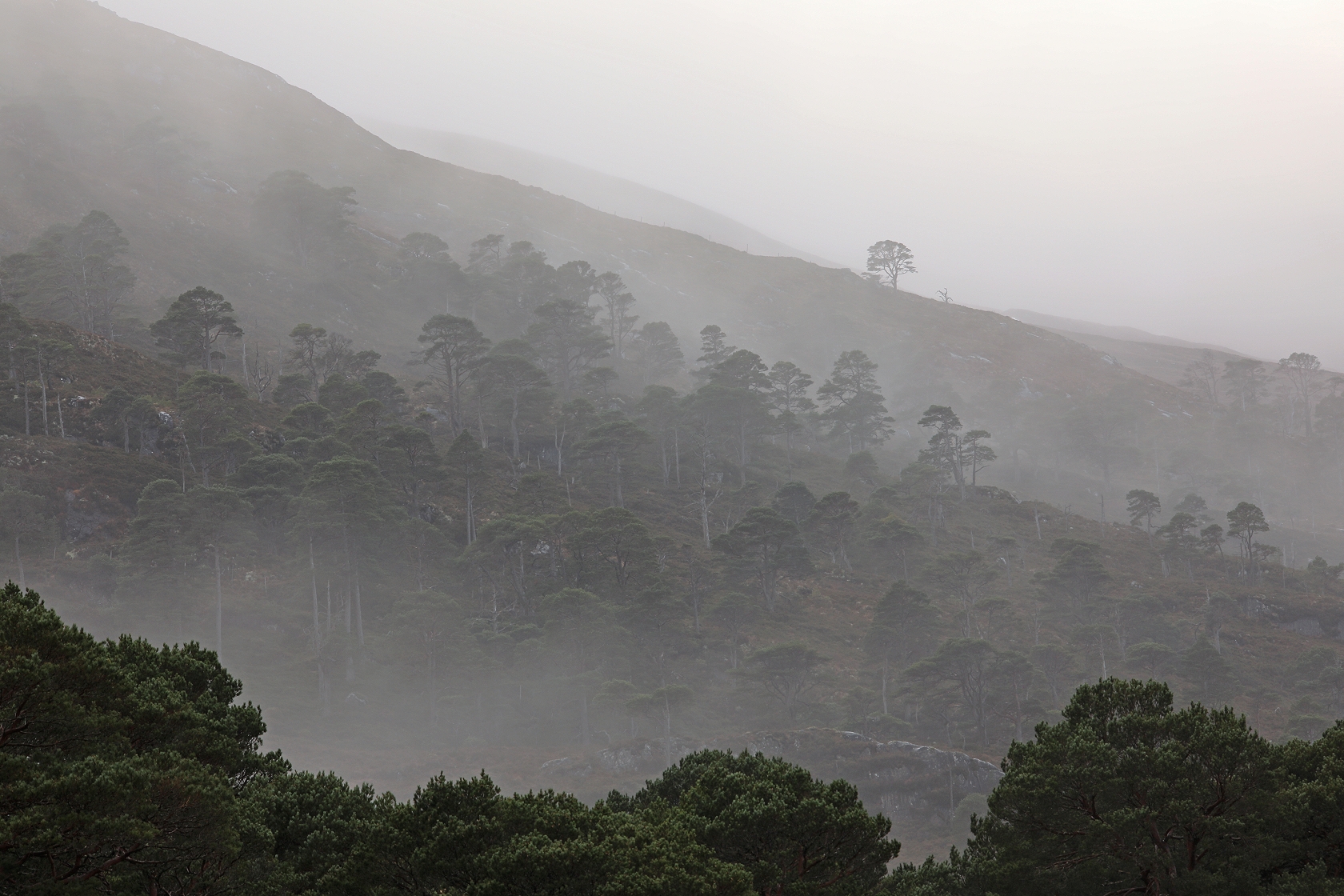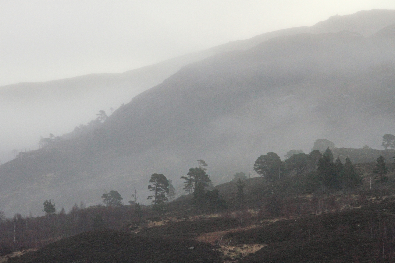 Near the Mullardoch dam, which dominates the section of the glen it is sited in, there are a few scattered old Scots pines (Pinus sylvestris) on the north side. Some of these were intermittently visible through the mist, appearing almost like ancient trees dating back from the mists of time, when the forest must have filled this part of Glen Cannich. Sadly only a handful of them survive in this area now, standing as lonely sentinels to their lost companions, and all the other life they must have formerly supported.