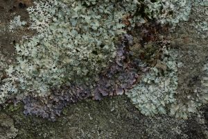 Map lichen is very widely distributed, occurring at northern latitudes in North America, the UK, Scandinavia and Asia, as well as in Patagonia and the Antarctic Peninsula. On another nearby rock, there were two different whitish lichens growing next to each other, and one of those had blackish raised lumps on its thallus. These were not the apothecia – the part that releases the spores of the fungal partner in the symbiotic organism that is a lichen – but instead were a lichenicolous fungus (Sclerococcum sphaerale) growing as a parasite on the lichen (Pertusaria corallina).