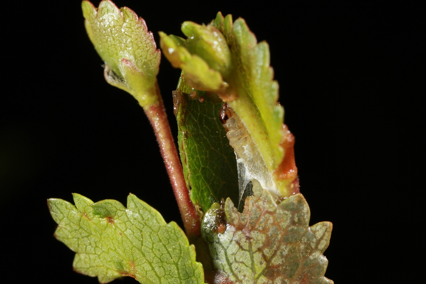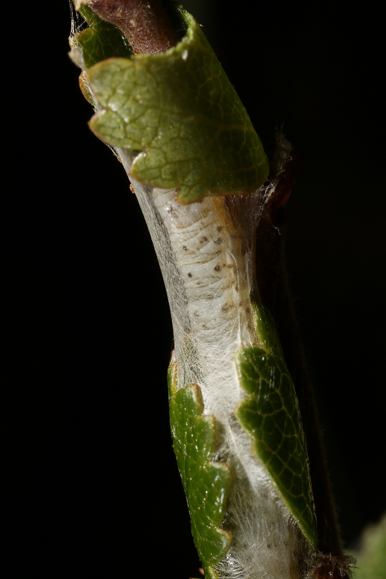 These images don’t really provide a sense of the scale though, as my macro equipment makes the caterpillar look quite large. However, the dwarf birch leaves are about the size of a person’s smallest fingernail, so it really was quite tiny, and was obviously the larva of a micro-moth. I did have some qualms about removing the caterpillar from the plant, but I knew it was the only way I would get it identified, so I decided to go ahead anyway. I cut off several inches of the dwarf birch below where the caterpillar was living, so that it would still have some leaves to feed on. However, I’d noticed that there wasn’t much feeding damage visible on the leaves, so I suspected that the caterpillar may have been just about ready to pupate, and had prepared the silken retreat to do so, out of sight of potential predators for the time when it would be completely vulnerable, as it underwent the metamorphosis from larva to adult moth.