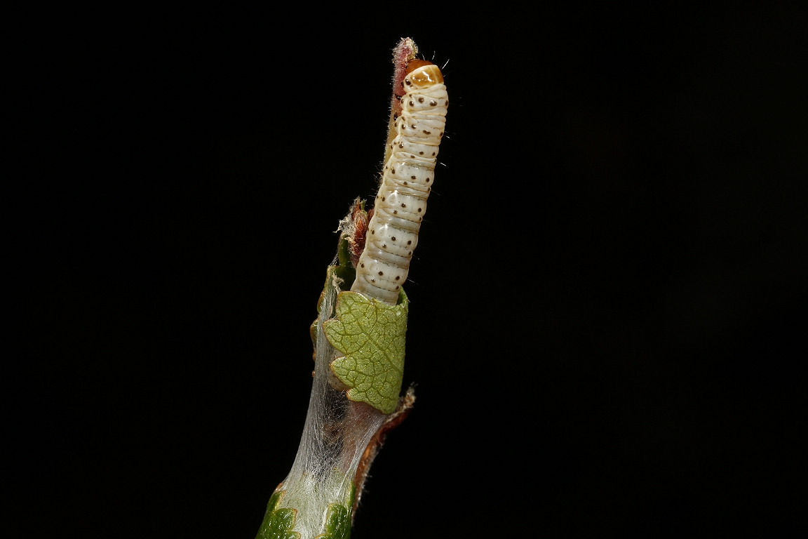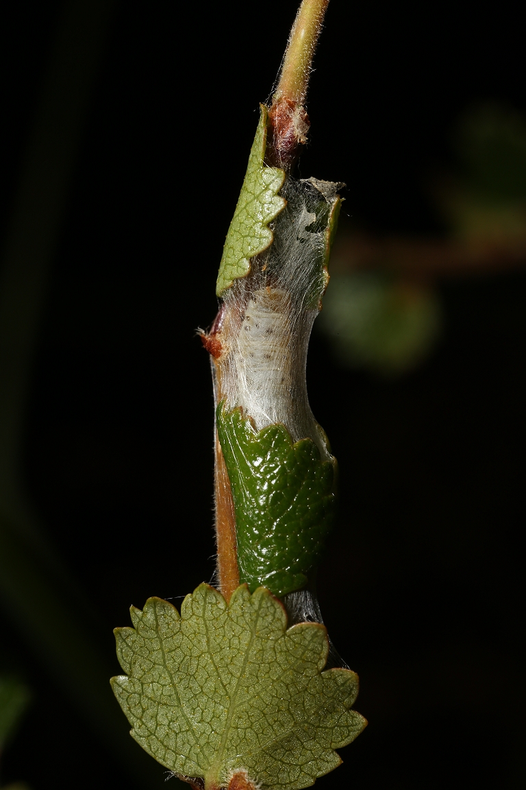 That changed though when I visited the same patch of dwarf birch in July this year. I was quite surprised to find, on the very same dwarf birch bush, and in virtually the same place on it, another caterpillar in a similar silk structure. This time though I was much better organised, and I took a series of photographs of the caterpillar, which seemed to cooperate with me by coming up out of the silk-spun leaves, so that I got a clearer view of it. I also knew that it would not be possible to identify the species from the caterpillar itself, so I clipped off the section of the dwarf birch plant it was on, to take it home so it could be reared to adulthood.