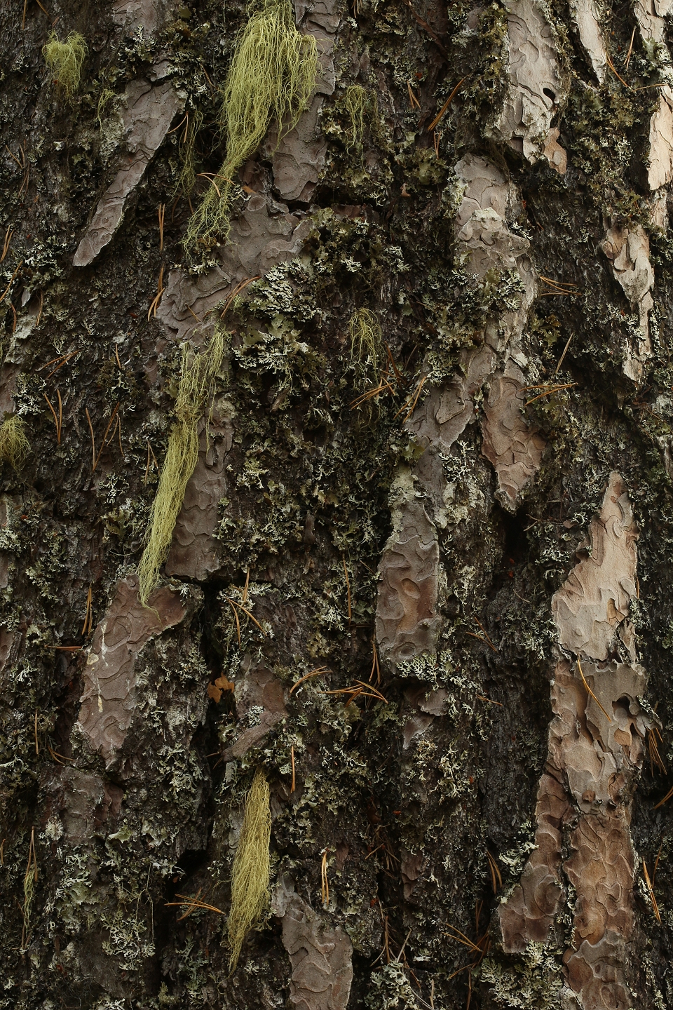 Another close up view of a section of the bark, with heather rags lichen (Hypogymnia physodes) and pine needles caught on invisible strands of spider’s silk.