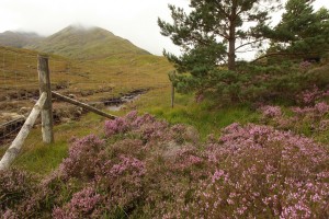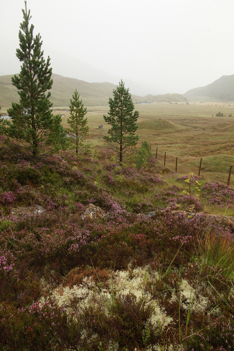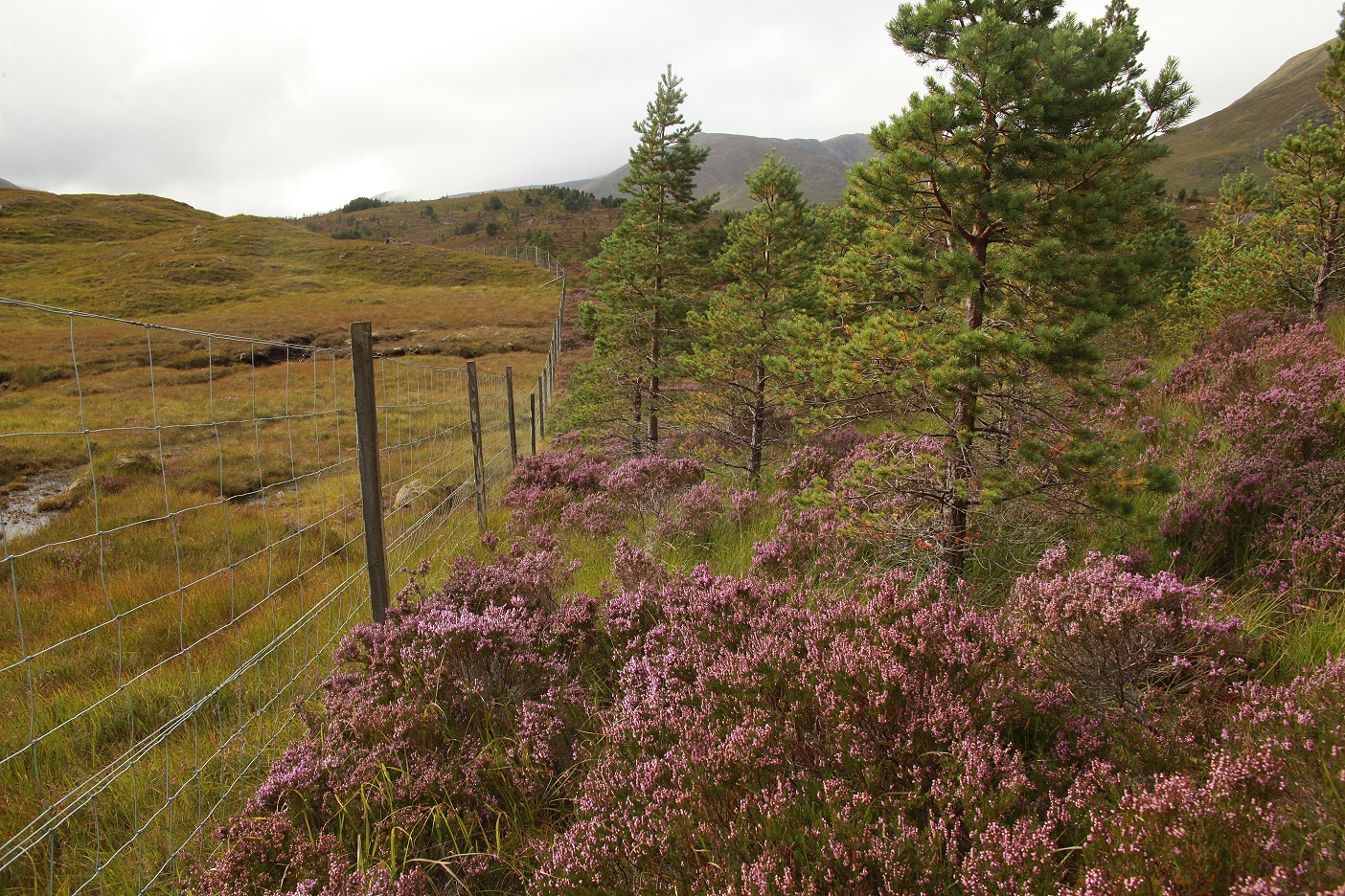 Planted Scots pines and blooming heather inside the fence at Athnamulloch contrast dramatically with the eroding peat hags and depleted landscape in the surrounding area.
