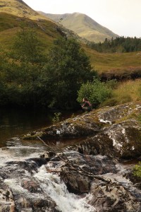 Jennie Martin contemplating the beauty of the Allt Gleann na Ciche burn near the Athnamulloch bothy. The young pines our volunteers planted inside the Athnamulloch exclosure can be seen in the top right of the photograph.
