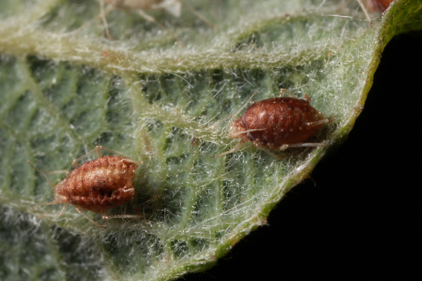Mummified aphids (possibly Cavariella theobaldi) on the underside of a leaf of the eared willow.