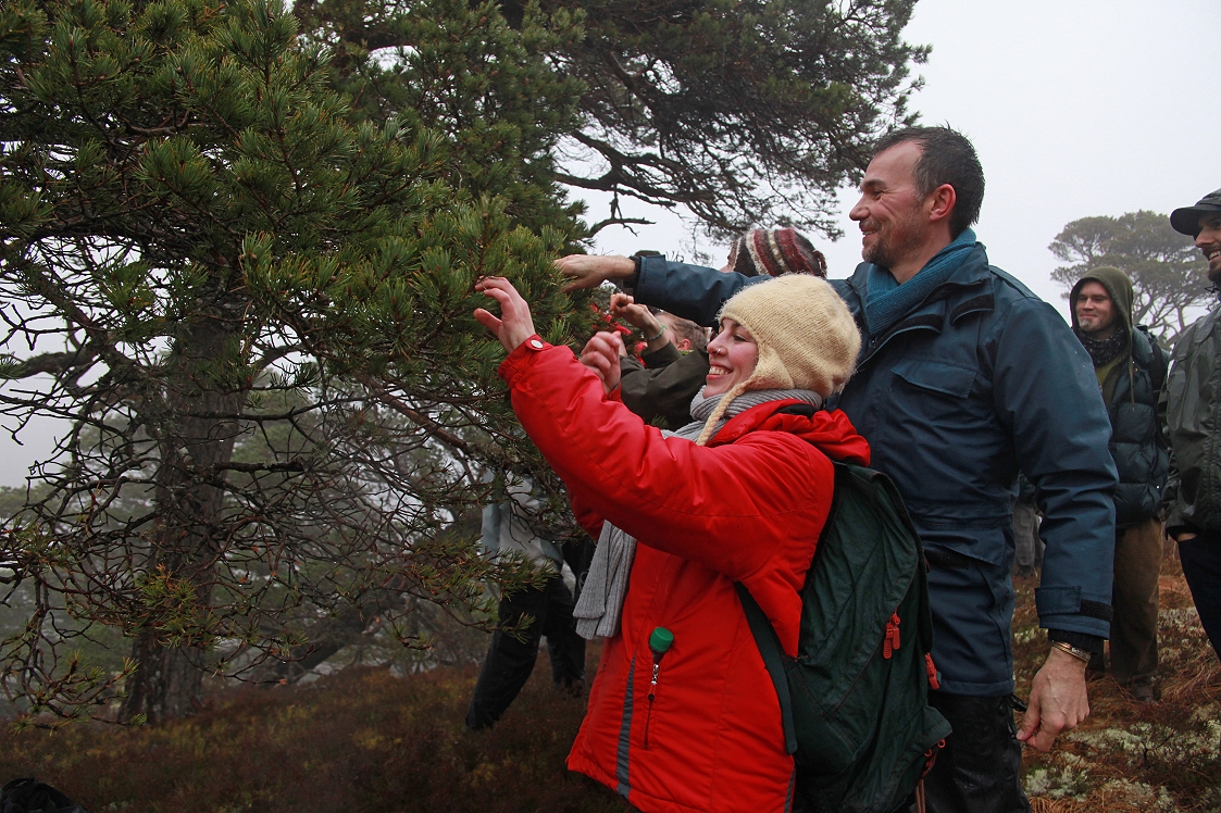 That isn’t the case at Coille Ruigh na Cuileige however, as there’s an estimated 100,000 young Scots pines regenerating there successfully in the 22 years since the fence went up, as well as birches, rowans, junipers and a few other trees such as holly and eared willow. It provides a powerful example of how the old forest remnants respond to the removal of grazing pressure, and it always touches and inspires groups that I take there, such as this one.