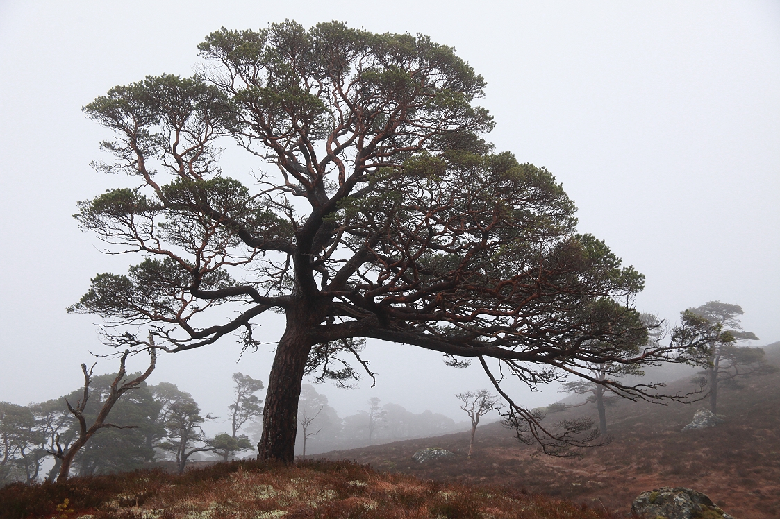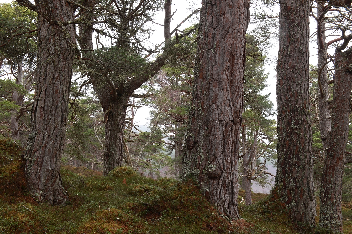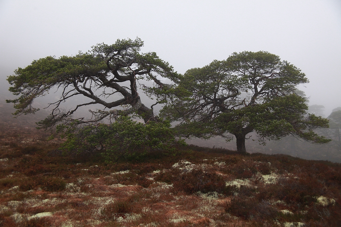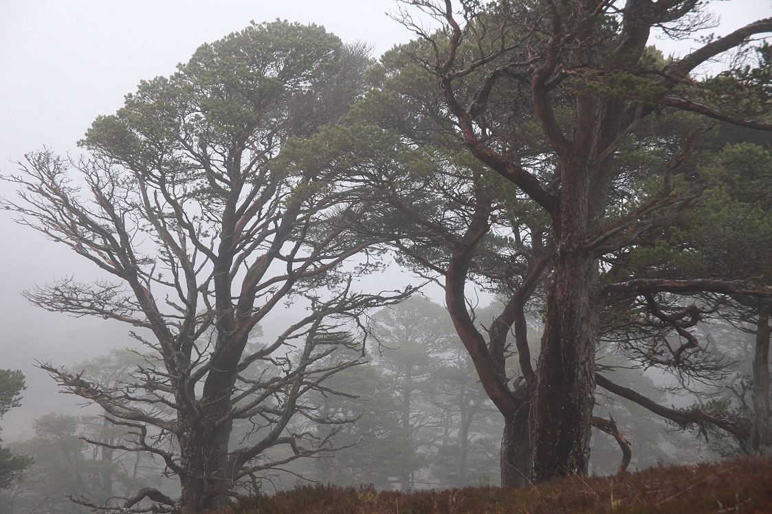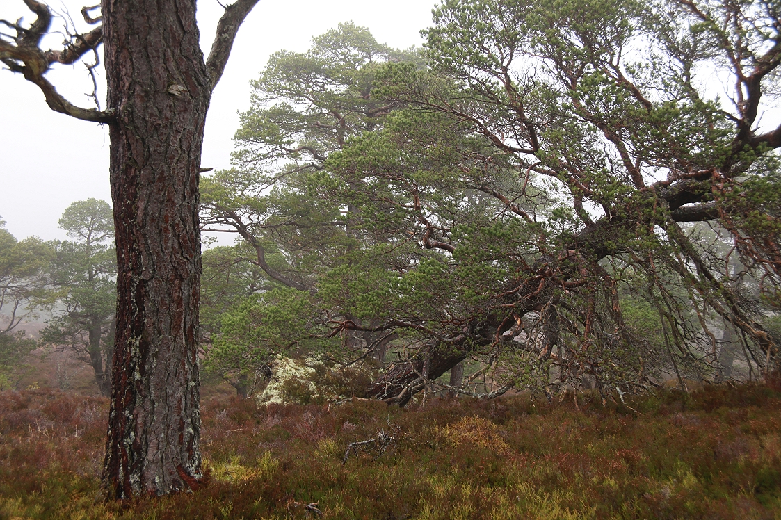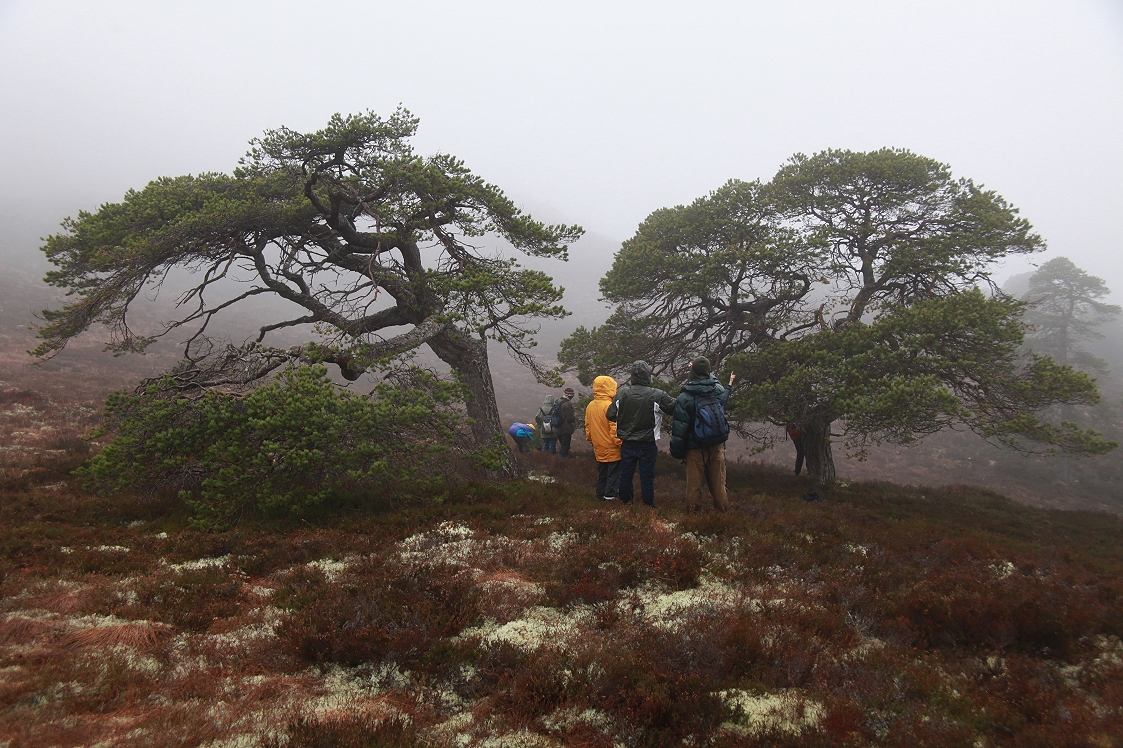 I find these days very evocative and magical, and said to the members of the group how I call them ‘Forest out of time’ days. This is for two reasons. Firstly, the venerable old Scots pines looming out of the fog always make me think of them as being the forest that stretches back through the mists of time, linking with the ancient forest that colonised the Highlands 10,000 years ago, when the glaciers retreated at the end of the last Ice Age. The other reason is of course that many of the surviving forest remnants are literally running out of time, as the old trees are dying of old age, and, in the absence of any regeneration measures, are not being replaced by a new generation of young pines and other native trees.