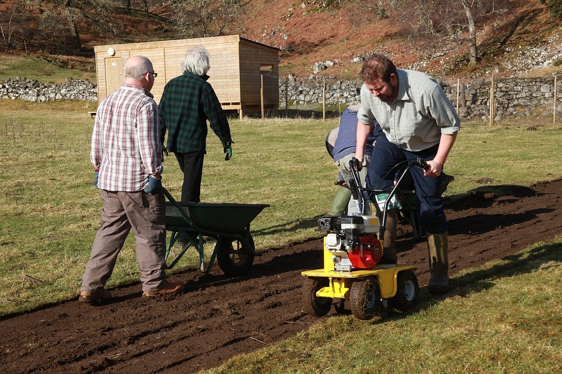 The third task for the day was to clear an area in the field next to the garden and existing poly-tunnel, near the office, for two new poly-tunnels to be erected there. This involved the removal of turf from the area, and Steve had rented a turf cutting machine for the day to help with this. This was the most physically-demanding of the jobs, but working in the sunshine helped, and made a pleasant contrast to the dreich weather of the previous day.