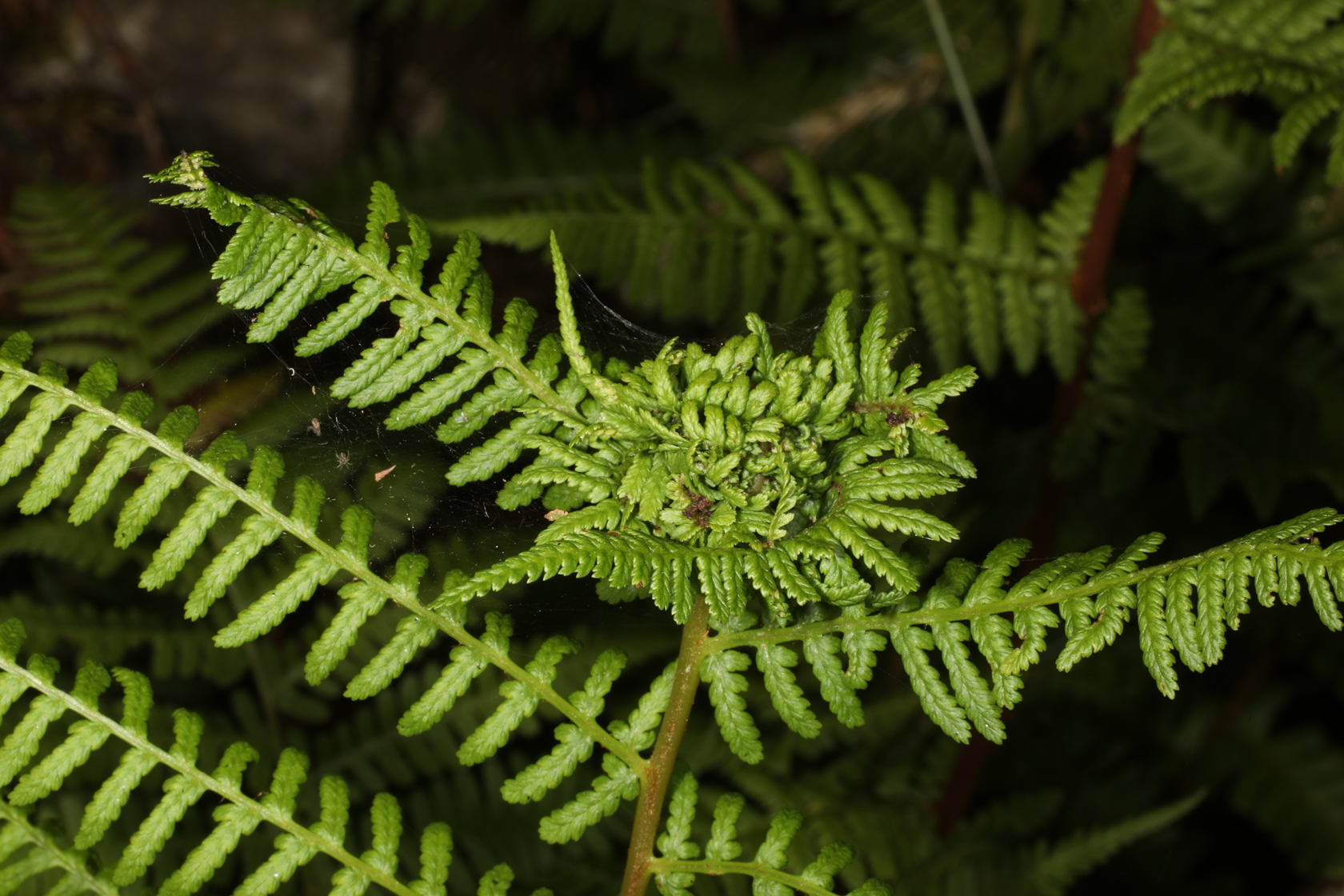 Not far from there I came across a male fern (Dryopteris filix-mas) with some of its fronds twisted around in a circular fashion, instead of branching out straight from a main stem or stipe. This unusual structure is a gall that is induced by the larva of a fly (Chirosia betuleti), and it can be found on several ferns, including the broad buckler fern (Dryopteris dilatata) and the lady fern (Athyrium filix-femina). The characteristic shape of the gall is the result of the larva chewing on one side of the stem, causing the frond to curl in a circular direction.