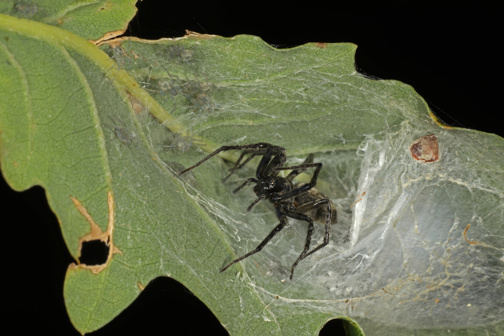 My next visit to the glen was in the middle of August and my first stop then was by the oak tree beside the bridge above Badger Falls. I’ve often found interesting invertebrates on this tree (including the Anyphaena accentuata and her spiderlings featured earlier in this blog), and this time was no exception, as I found a fungus growing out of the corpse of a dead spider on the underside of one of the leaves. Fungi that grow out of insects and spiders are known as entomophagous fungi (which means literally ‘invertebrate eating’), and I’ve been interested in them for some years. Unfortunately I haven’t been able to get this one identified yet, but Edward Milner did examine the spider and told me it was probably a ground-weaver spider (Lepthyphantes minutus), but it was too decomposed by the fungus to be completely sure.