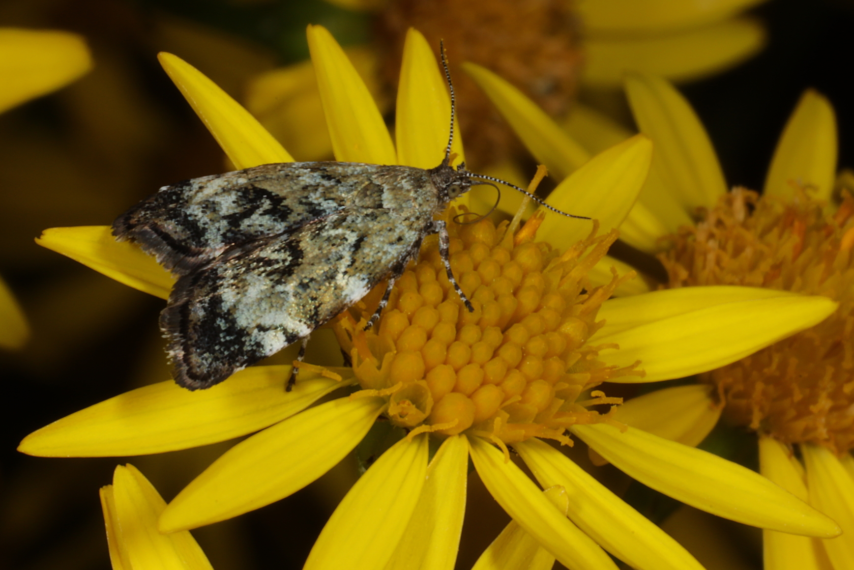 I regularly see this moth feeding on ragwort flowers in late summer, and they always seem totally immersed in their feeding, oblivious to my presence near them. They appear to feed for extended periods of time, and this one had pollen grains all over its proboscis, antennae and eyes. The antler moth is a member of the Noctuidae family, all of which are known to act as plant pollinators, and there’s no doubt that this one would be transferring pollen to the next ragwort flower it visited.